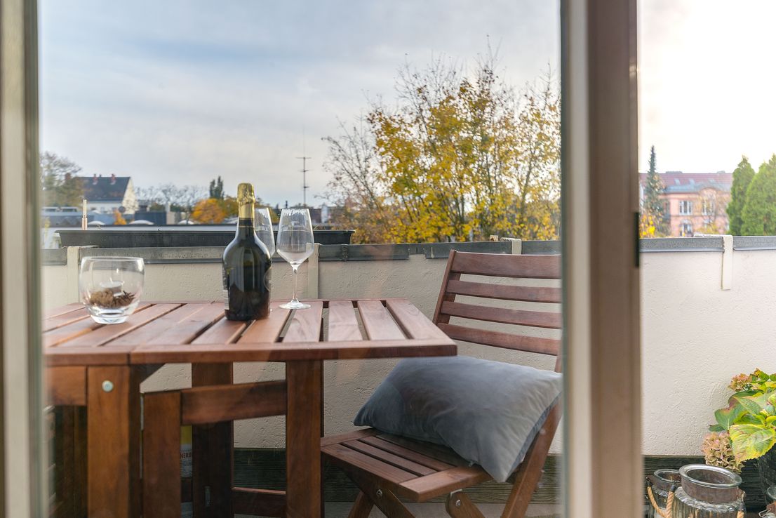 Der Außenbereich des Hauses bietet einen schick angelegten Innenhof, der zum Frühling seine volle Pracht entfaltet. Doch auch jetzt zur kälteren Jahreszeit stimmen die Vögelchen Ihre Gesänge an. Wirklich idyllisch! Nach hinten liegt auch Ihr Balkon, mit Ausblick auf den grünen Innenhof sowie das Planetarium. Der Balkon bietet genügend Raum für Sitzgelegenheiten und schafft viel Licht im angrenzenden Wohnbereich. Hier lässt es sich gut leben.