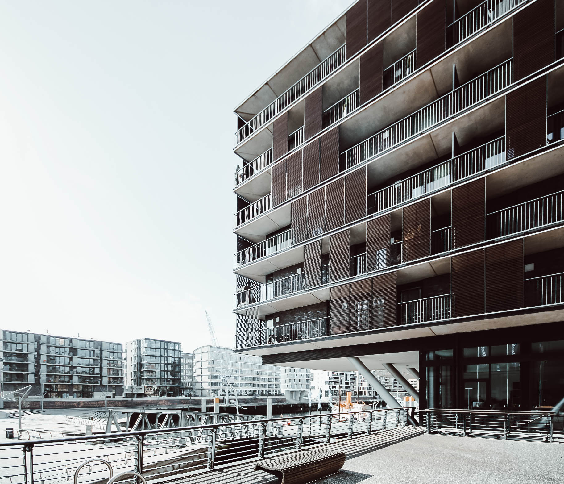 Das 2006 gebaute Haus hat zwei Eingänge, ein prächtiges Treppenhaus und eineerstklassige, sehr freundliche Nachbarschaftsgemeinde. Entweder Sie flanieren am Hafen entlang und gehen an einem der leckersten Sushi-Restaurants Hamburgs vorbei und gelangen durch den erhöhten Eingang in das Treppenhaus, oder Sie kommen aus der Speicherstadt, die auf der anderen Straßenseite beginnt, und gelangen auf ebener Erde in den spektakulären Hausflur. Möwen, die am Fenster vorbei Richtung Hafen fliegen, verbreiten schlussendlich dann den ultimativ maritimen Hamburg Flair.