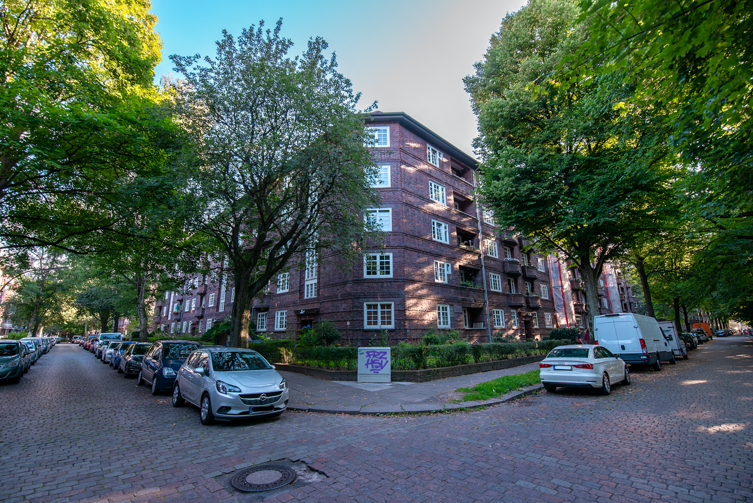 Die Wohnanlage ist eingebettet in eine sehr grüne und ruhige Umgebung. Die vier umgebenden Straßen liegen in einer Tempo 30-Zone und sind mit Bäumen gesäumt. Auch die Innenhofseite ist sehr ruhig – der Innenhof unterliegt keinerlei Nutzung durch Bewohner, als Spielfläche o.ä., und ist daher ein Quell der Ruhe. Da die Wohnanlage ein wenig ’versteckt‘ liegt, ist die Parkplatzsituation für Hamburger Verhältnisse entspannt.z