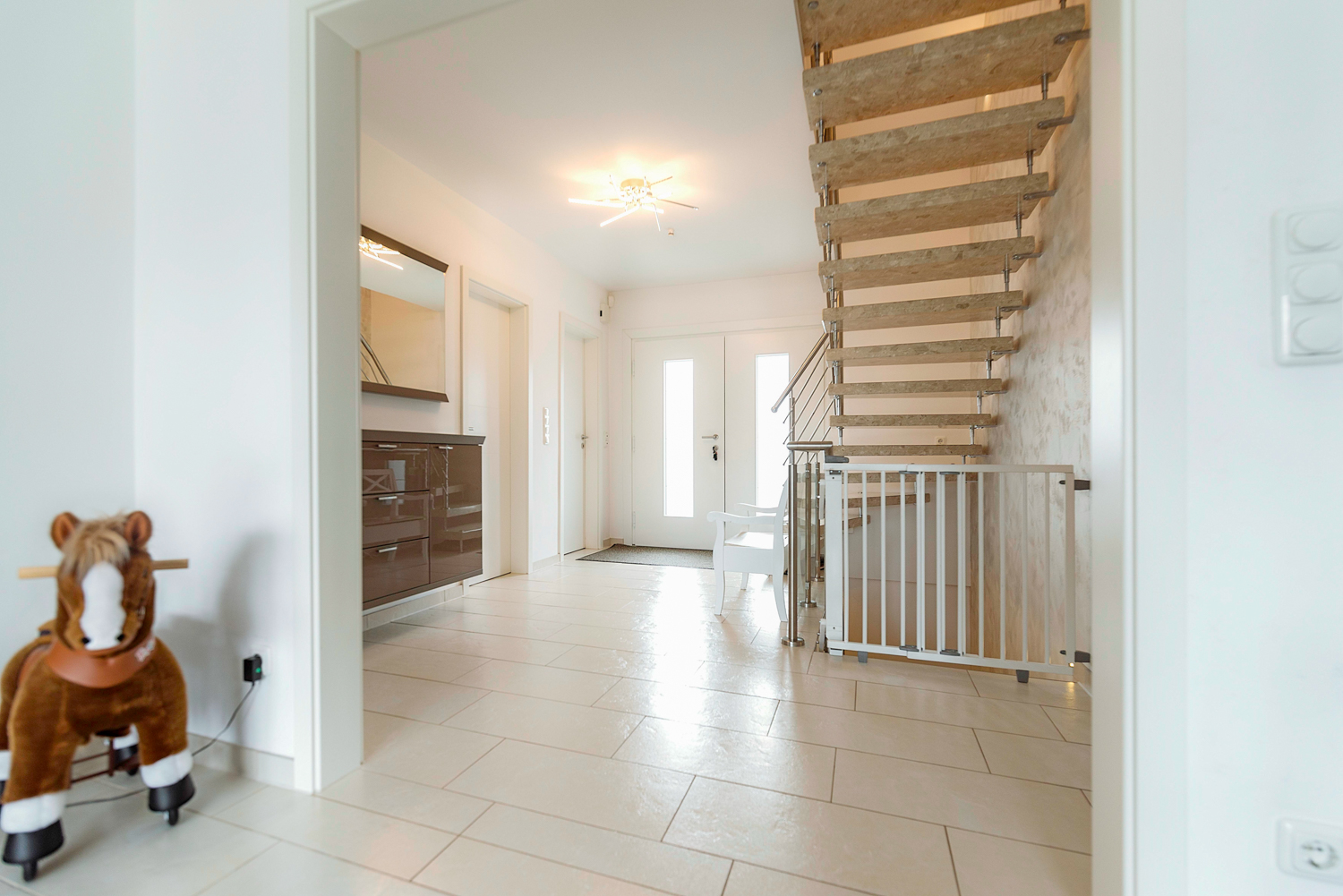 Die hellen Zimmer sind schön geräumig. Die Nutzungsmöglichkeiten der zahlreichen Zimmer reichen von Kinderzimmer bis hin zum Home-Office oder Gästezimmer. Oben befinden sich 3 weitere separate Schlafzimmer, die alle von der Ruhe draußen profitieren – mit offenen Fenstern schlafen