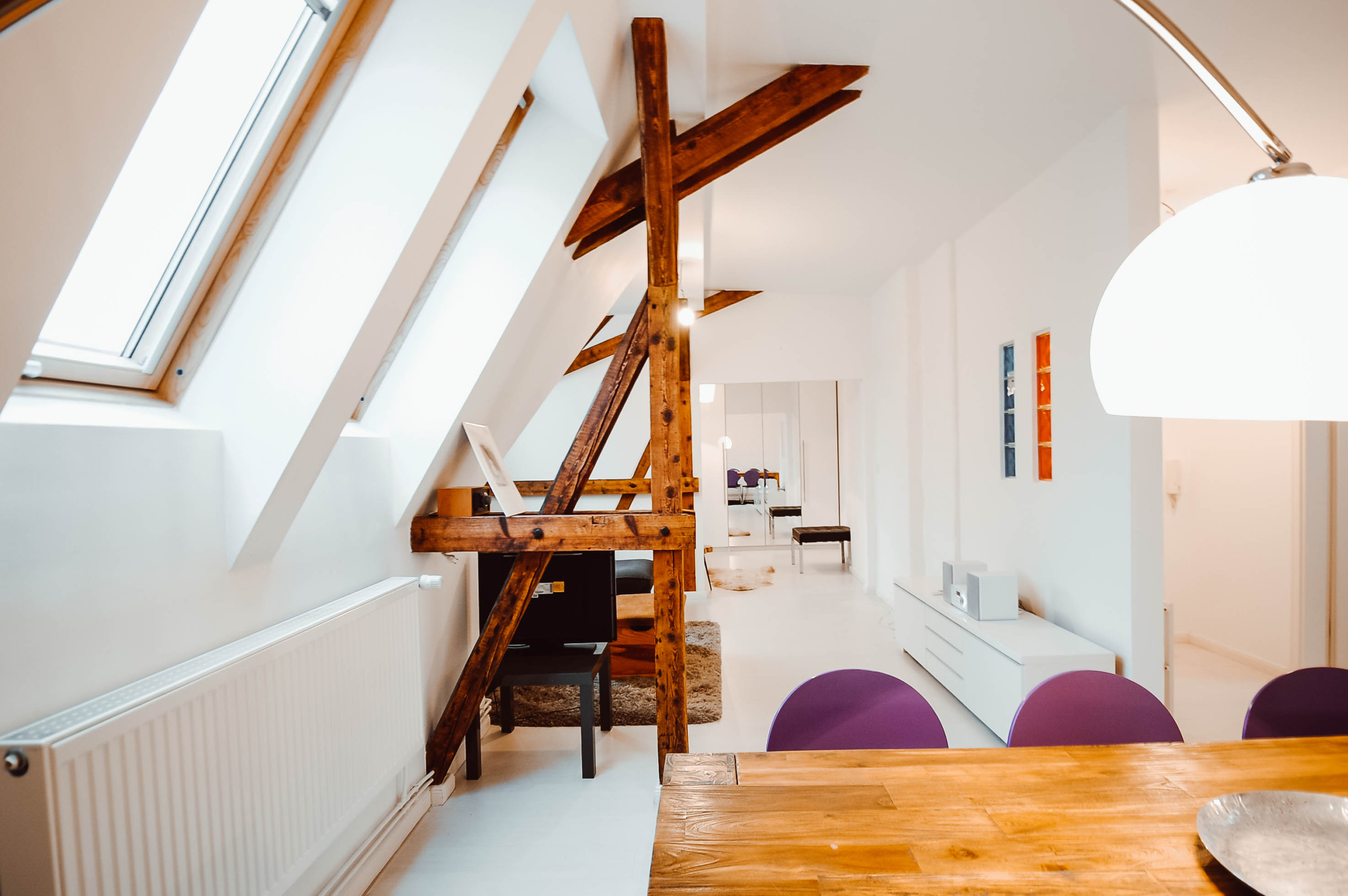 Dieses gut geschnittene 65 m² Loft verfügt über einen einladenden Wohn-/Essbereich. Besonders schön: Die Holzbalken die dieses Loft gemütlich und außergewöhnlich machen. Die Dachterrasse eignet sich dank ihrer Größe ideal für Grillpartys mit Ihren Liebsten und Freunden. Der erste Kaffee am Morgen gemeinsam mit den ersten Sonnenstrahlen des Tages erwarten Sie genau hier! Sie gelangen aus der offenen Wohnküche auf Ihre persönliche Dachterrasse.